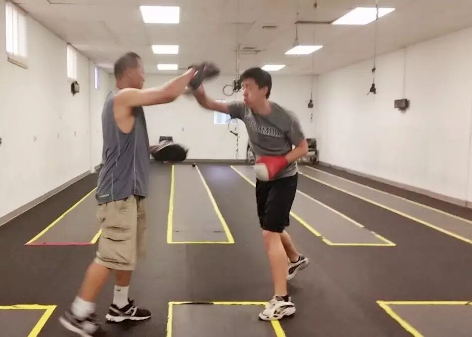 图为:李广教练(左)在波士顿培养小拳击手
