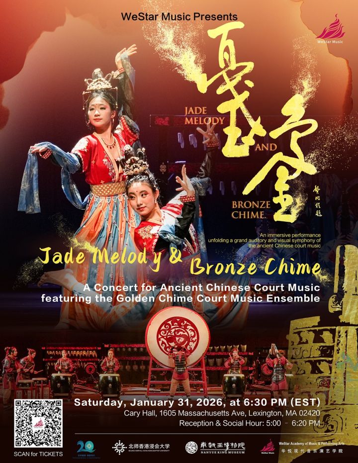 马萨诸塞州 Lexington —— WeStar Music 隆重呈献《戛玉鸣金》中国古代宫廷编钟音乐会,这是一场弘扬中国传统宫廷音乐的非凡音乐会。本场演出由 WeStar Music 与 玉振金声雅乐团 联合推出,将于 2026年1月31日(星期六)晚6:30 PM 在马萨诸塞州列克星敦历史悠久的 Cary Hall 举行。音乐会前设有 5:00 PM 开始的招待会与展览互动时光。
